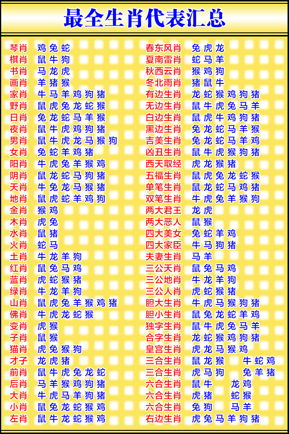 琴:兔蛇鸡★棋:鼠牛狗 书:虎龙马★画:羊猴猪 |